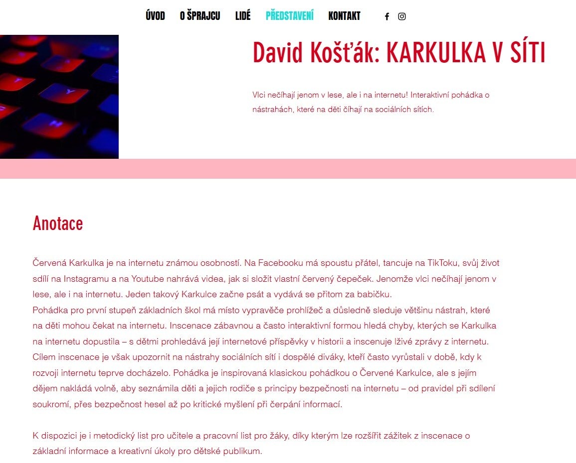Herecký soubor skvěle zpracoval téma internetu, sociálních sítí a kyberšikany způsobem, který děti dokázaly snadno pochopit a zároveň si ho velmi užily. Příběh Karkulky v novém kabátě nás všechny přiměl zamyslet se nad bezpečným a zodpovědným používáním digitálních technologií.